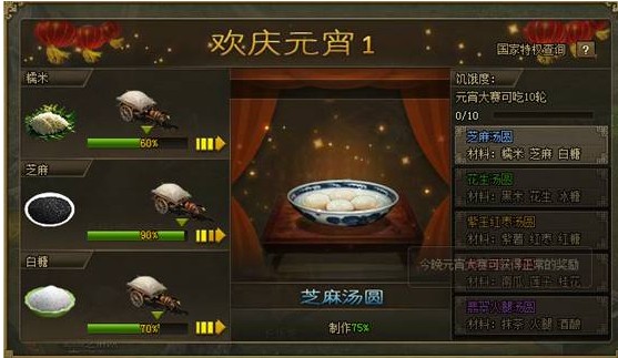 2. 吃汤圆总共有10轮。每位玩家有3轮免费吃的机会,每参与一个阶段的“制作元宵”国家任务就可以额外获得1轮机会(最多5轮),可以花微量金币购买吃汤圆的次数。