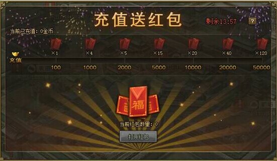 注:充值所赠送红包,可累积领取(例:累计充值满50000金币,共可获赠205个红包)