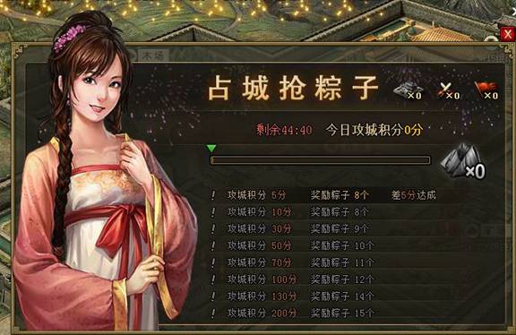 活动内容:活动期间,每天根据占城积分获得粽子,积分越高,粽子越多。