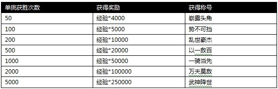活动内容:单挑次数达到一定数量即可获得海量经验,还可获得万人景仰的称号