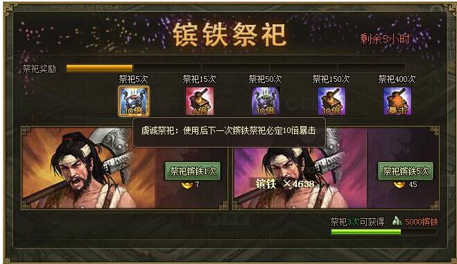 1. 每3次镔铁祭祀,可额外获得5000镔铁赠送;