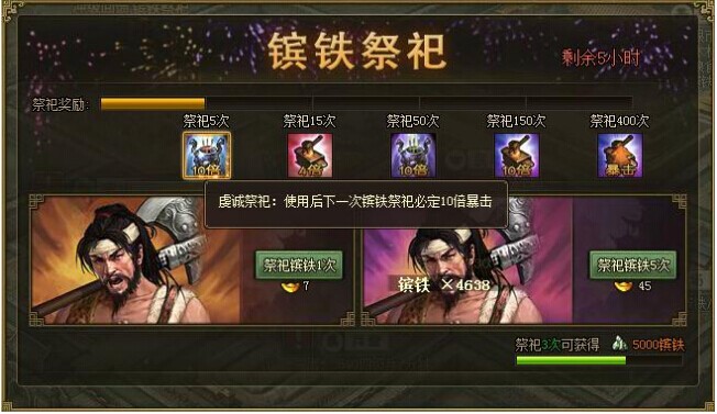 1. 每3次镔铁祭祀,可额外获得5000镔铁赠送;