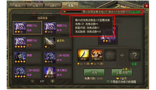 1. 累积洗炼点数,领取免费至尊洗炼次数:每累积满10点洗炼点数,即可获得1次免费至尊洗炼