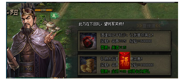 1. 结交名士奖励:每次结交名士,可随机获得经验、粮食、镔铁、兵营区翻倍令的其中一种