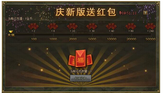 注:充值所赠送红包,可累积领取(例:累计充值满50000金币,共可获赠410个红包)
