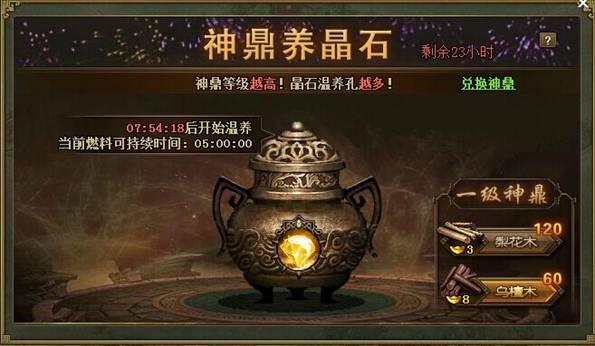 活动内容:活动期间,通过宝石商会获得神鼎,使用神鼎对晶石进行温养,可轻松提升晶石的进阶速度。神鼎等级越高,可温养的晶石数量越多,实力提升也越快!