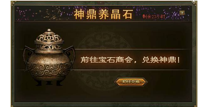 活动内容:活动期间,通过宝石商会获得神鼎,使用神鼎对晶石进行温养,可轻松提升晶石的进阶速度。神鼎等级越高,可温养的晶石数量越多,实力提升也越快!