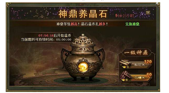 温养燃料:分为“梨花木”和“乌檀木”。神鼎每升一级,免费赠送100个梨花木。玩家也可使用金币直接购买;