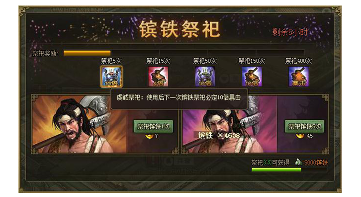 1. 每3次镔铁祭祀,可额外获得5000镔铁赠送;