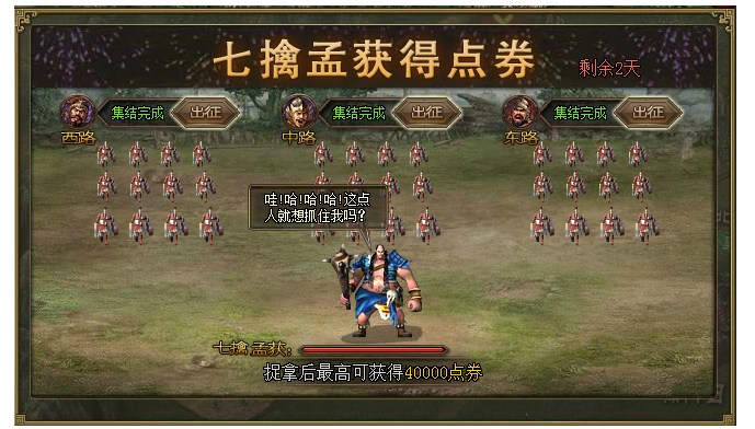活动玩法:活动期间,通过任意战斗中的“借兵”(除单人剧本和世界剧本的借兵),可补充攻击“孟获”的三路大军兵力,每一路兵力补满,可发动一次出征,每3次出征,可抓获1次“孟获”。反复抓住7次后,即可获得大量点券!