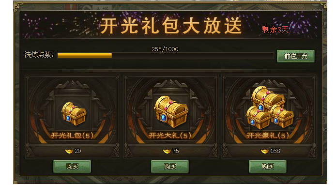 - 活动期间,玩家可在活动界面花费金币,直接购买开光礼包,打开礼包,可直接获得开光所需的洗炼点数;