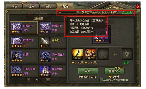 1. 累积洗炼点数,领取免费至尊洗炼次数:每累积满10点洗炼点数,即可获得1次免费至尊洗炼