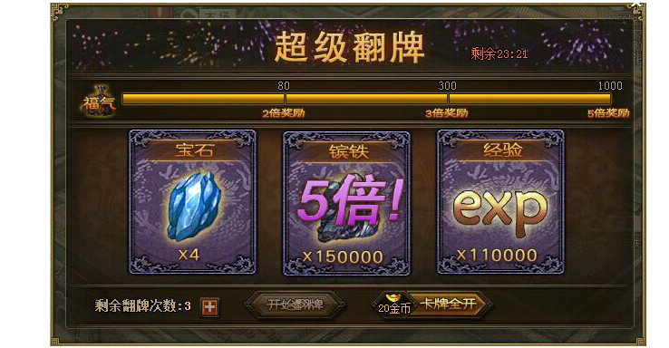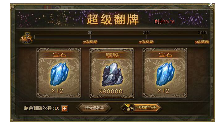 2) 福气值累积分别达到80、300、1000时,对应可获得2倍、3倍、5倍翻牌奖励加成!全天有效!