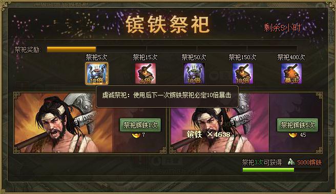 1. 每3次镔铁祭祀,可额外获得5000镔铁赠送;
