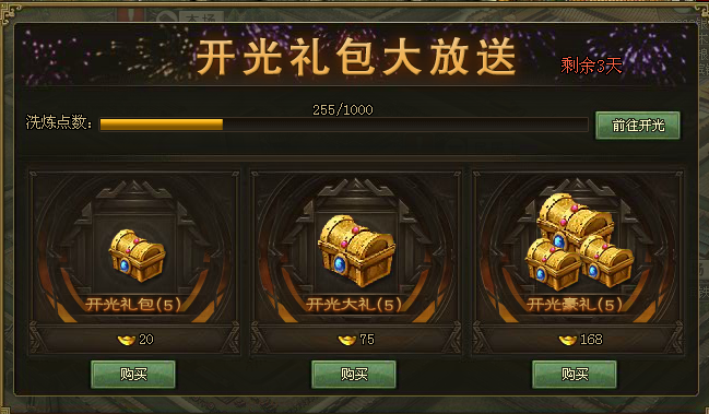 - 活动期间,玩家可在活动界面花费金币,直接购买开光礼包,打开礼包,可直接获得开光所需的洗炼点数;