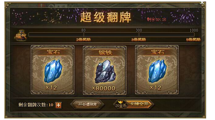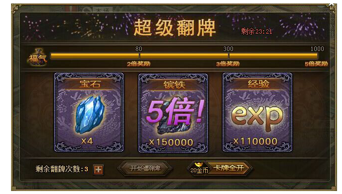2) 福气值累积分别达到80、300、1000时,对应可获得2倍、3倍、5倍翻牌奖励加成!全天有效!