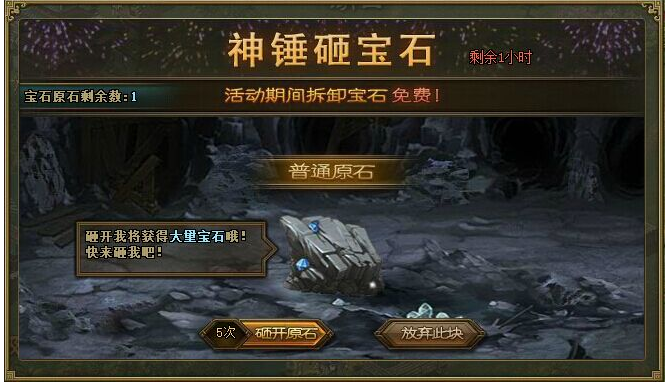 活动内容:活动期间,世界上会出现“宝石原石”事件、玩家可选中免费原石,也可花费金币获得高级原石。获得原石后,玩家可在活动界面,消耗“砸原石次数”将“宝石原石”砸开获得宝石。(※ 活动特惠:本活动期间,摘取已镶嵌在兵器上的宝石,免费!)