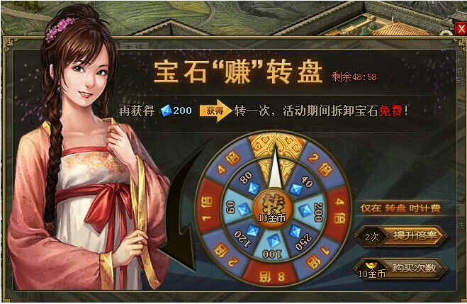 玩法提示:1. 可花费金币,直接购买转盘次数;