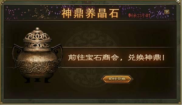 活动内容:活动期间,通过宝石商会获得神鼎,使用神鼎对晶石进行温养,可轻松提升晶石的进阶速度。神鼎等级越高,可温养的晶石数量越多,实力提升也越快!