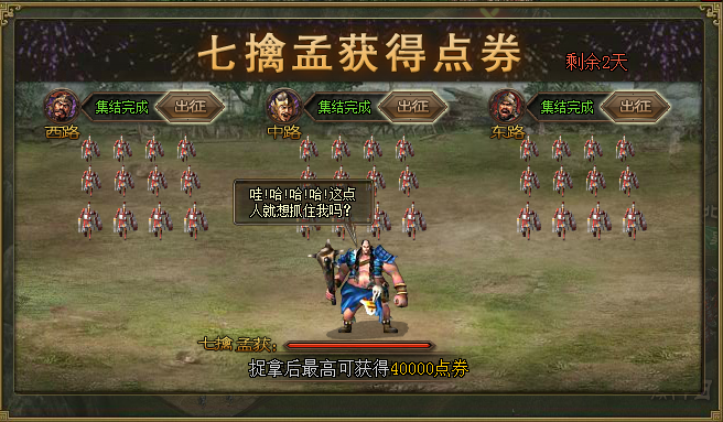 活动玩法:活动期间,通过任意战斗中的“借兵”(除单人剧本和世界剧本的借兵),可补充攻击“孟获”的三路大军兵力,每一路兵力补满,可发动一次出征,每3次出征,可抓获1次“孟获”。反复抓住7次后,即可获得大量点券!