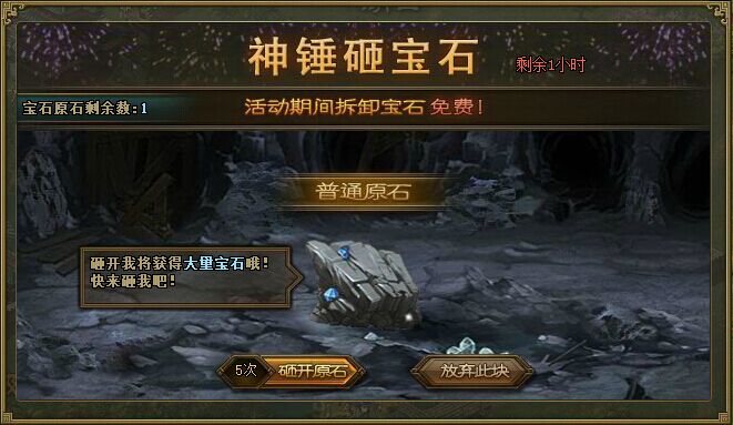 活动内容:活动期间,世界上会出现“宝石原石”事件、玩家可选中免费原石,也可花费金币获得高级原石。获得原石后,玩家可在活动界面,消耗“砸原石次数”将“宝石原石”砸开获得宝石。(※ 活动特惠:本活动期间,摘取已镶嵌在兵器上的宝石,免费!)