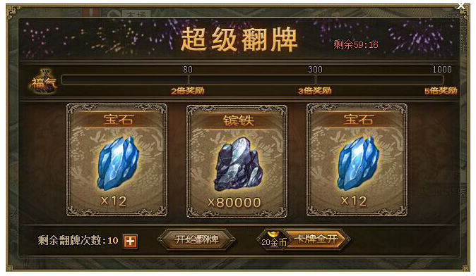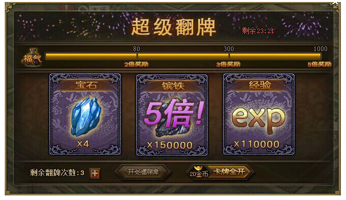 2) 福气值累积分别达到80、300、1000时,对应可获得2倍、3倍、5倍翻牌奖励加成!全天有效!