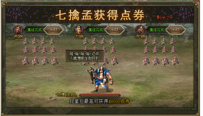 活动玩法:活动期间,通过任意战斗中的“借兵”(除单人剧本和世界剧本的借兵),可补充攻击“孟获”的三路大军兵力,每一路兵力补满,可发动一次出征,每3次出征,可抓获1次“孟获”。反复抓住7次后,即可获得大量点券!