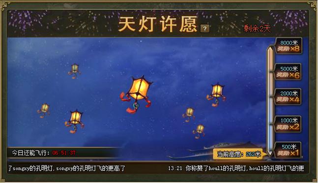 活动内容:活动期间,玩家可以放天灯,领奖励。天灯飞的越高,奖励越多!