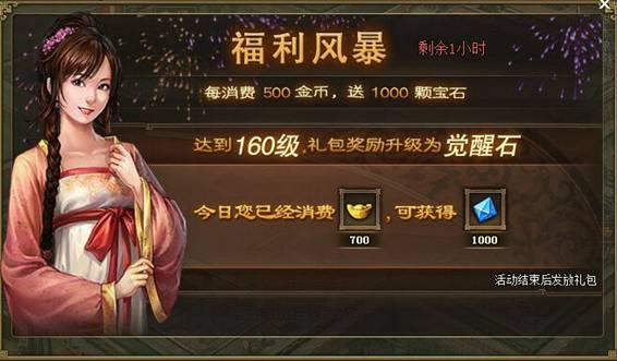 活动内容:活动期间,每次累计消耗满500金币,不同等级可对应获得一份宝石大礼。而160级满级玩家,则可获得觉醒石。