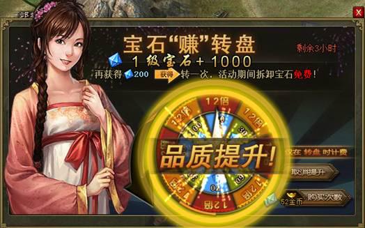 活动内容:活动期间,分别存在“宝石”和“镔铁”两个转盘,按照自己的需要,可随心所欲的选择转盘,获得宝石或镔铁。