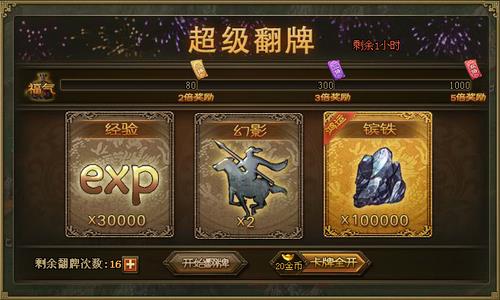3. 超级翻翻翻,翻出大奖牌:活动期间,等级达到100级的玩家只要翻出鸿运卡牌,下次翻牌必将出现三张大奖牌,大奖牌将送出丰厚的镔铁奖励,奖励随等级的提高而增加,最高单次可获得30万镔铁奖励。
