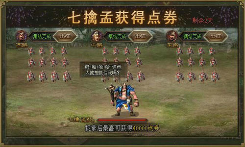 活动玩法:活动期间,通过任意战斗中的“借兵”(除单人剧本、世界剧本的借兵以及突击幻影、单挑幻影),可补充攻击“孟获”的三路大军兵力,每一路兵力补满,可发动一次出征,每3次出征,可抓获1次“孟获”。反复抓住7次后,即可获得大量点券!