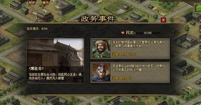 在游戏中当主城达到20级,各资源区中,升级建筑或每隔一段时间会产生一个政务事件,玩家可以通过从2种方案中选择一种政务处理方法以获得相应政务奖励的资源或民忠,资源可用来从事各项实力提升,而民忠累积到100后奖励大量资源。
