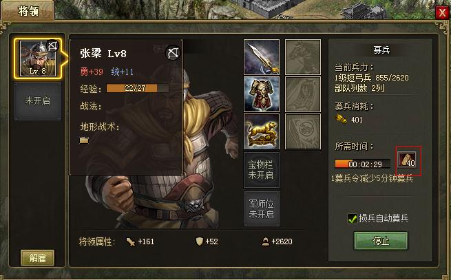 接下来招募士兵之后继续征战,这里可以使用募兵令快速招募。募兵令的作用就是“一个募兵令减少5分钟募兵时间”。