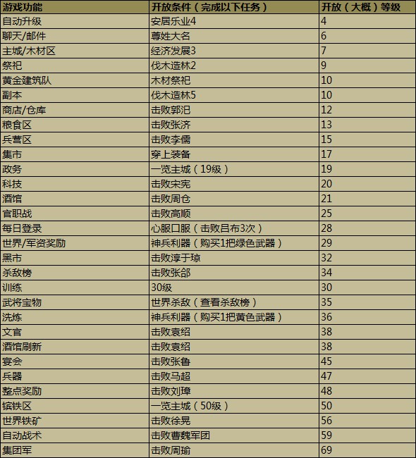 相信很多刚进入游戏的玩家经常会为一个问题所困惑,就是功能开放,自己要达到什么样的条件才会开启更强大的功能呢?今天就帮玩家详细的介绍下《攻城掠地》中每个功能开放的条件。在下根据自己的体验列了一个表格,希望对各位看客有所帮助,不喜勿喷。