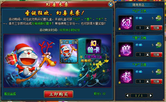 活动规则:活动期间,可以在圣诞嘉年华界面中购买到幻兽礼盒,开启礼盒可以获得“幻”“兽”“卡”之一,凑齐三字即可合成珍稀绝版幻兽卡!单独使用三字中任何一字,可以获得大量的奖励哦!