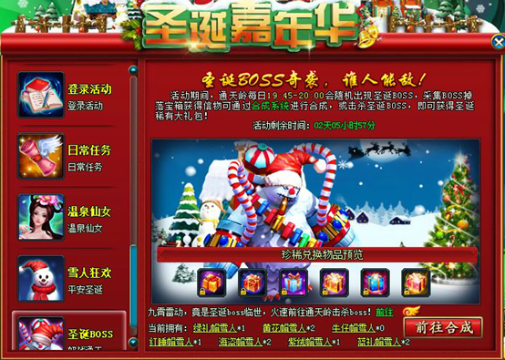 活动规则:每天19:45-20:00会随机出现圣诞BOSS,采集BOSS掉落宝箱获得信物可以通过合成系统进行合成,或击杀圣诞BOSS,即可获得圣诞稀有大礼包哦!