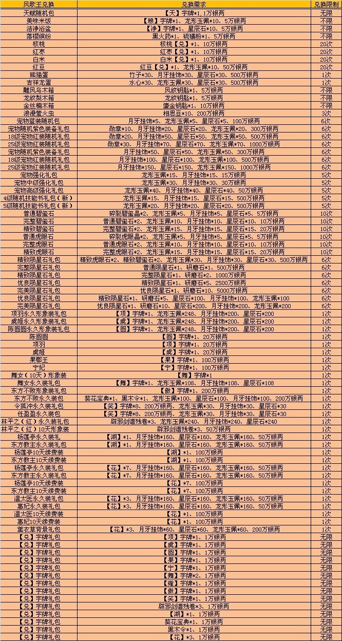 【活动内容】:活动期间,凤歌王兑换开启,本次兑换增加了对以往宴会形象装字牌的回收兑换以及相关字牌的最后一次形象装兑换(仅此一次),还有不需要勋章就可以兑换的高级宠物装备,4/5级技能书礼包~~快来兑换吧