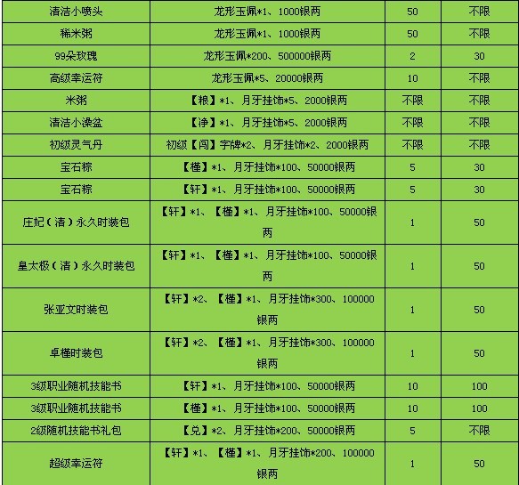 活动期间内,累计消费≥5000元宝,即可获赠:10万银两包*5、99朵玫瑰*1、特级幸运符*5、2级随机技能书*5(内含本职业技能书!)