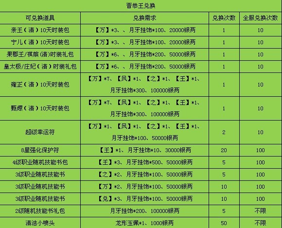 【活动内容】:活动期间内。游戏内晋王府-----晋恭王处兑换活动奖励开启,详细如下