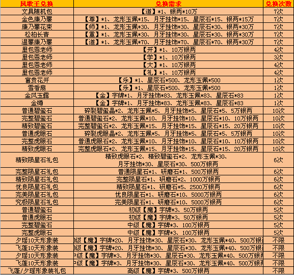 【活动内容】:活动期间,凤歌王兑换开启,慷慨的凤歌王为大家准备了大量极品,快来兑换吧