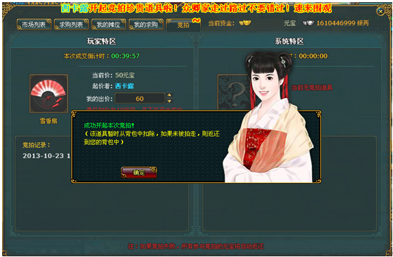 1、开起竞拍成功后,要拍卖的道具将会暂时被系统保管,拍卖结束时将发放到竞拍成功玩家礼品盒内或者发起竞拍的玩家背包内;