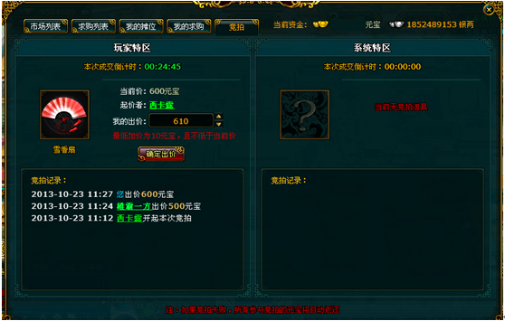 3、参与竞拍时,会暂时扣除竞拍输入的元宝,如果竞价被他人超过,会当即返还元宝;在下次出价时,元宝会重新暂时扣除;如果
