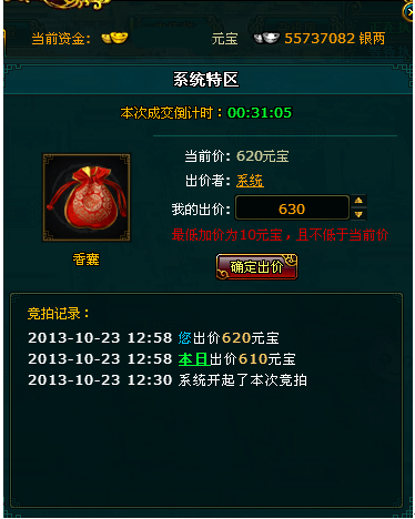 打开交易——竞拍界面,系统已自动将需出最低价格填好,点击“确定出价”即可,系统会暂时扣除对应的元宝数。