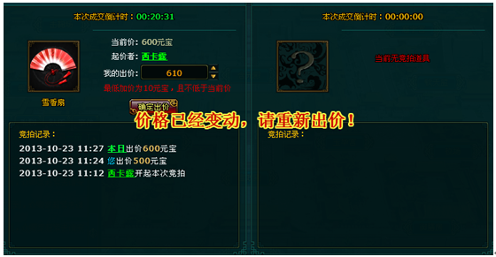 注意:如果您的交易界面一直在打开状态,竞拍记录是不会自动刷新的,需要您重新打开交易,或者点击一次确定出价,系统会有两种提示:A、价格已经变动,请重新出价;