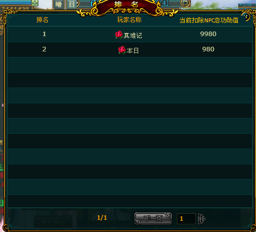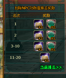 (5)当NPC功勋值归0后则活动自动结束,上书排名奖励发送到玩家礼品盒,同事系统广播消息“皇帝陛下明察秋毫,已将XX打入天牢之中,皆大欢喜!”
