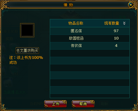 弹劾需要耗费相应的上书类物品,在此界面选择好自己需要使用的上书物品后,点击“上书”按钮就可以对NPC进行弹劾了。