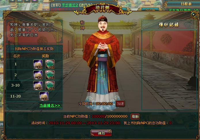 (4)在清君侧主界面点击当前排名,则可以查看在整个过程中对NPC弹劾的排行榜,此排行榜以玩家对NPC扣除功勋值的数量来进行排名: