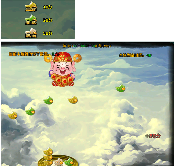 2、接到的水饺有相应的积分,接到水饺越多,积分越多,获得积分之后可兑换相应道具奖励;