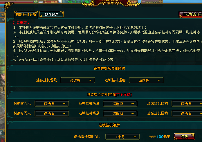 3、该挂机只在玩家刷迷城时可使用,可选择的挂机场景和怪物必须为已经成功挑战过的场景和怪物,使用后可获得迷城正常掉落奖励;